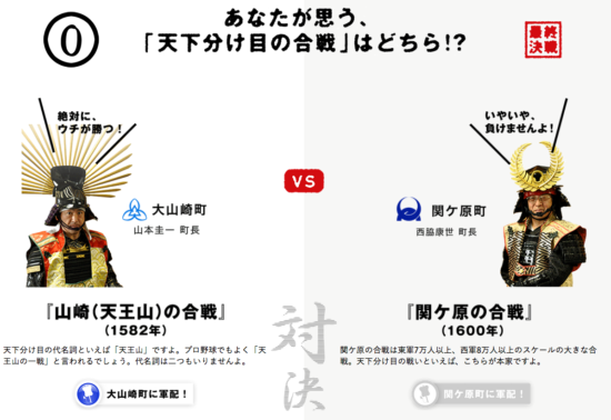 ホーム > つれづれ > さすがに【天王山の決戦】より【関が原の決戦】の方が有名じゃないかな? 2017/02/27 2017/02/28 【天王山の決戦】があった大山崎町 と 【関が原の決戦】があった関ヶ原町 が面白い対決しています。 あなたが思う天下分け目の決戦はどっちだろう? 各町がHP上でどっちが有名か対決していますw となり町大山崎に勝ってほしいけど、贔屓目に見ても明らかに関が原が有名ですよね。 みなさんはどっちが天下分け目の決戦だと思いますか? - つれづれ Tweet Please enable JavaScript to view the comments powered by Google+. Loading Facebook Comments ... Please enable JavaScript to view the comments powered by Facebook. Message コメントをキャンセルメールアドレスが公開されることはありません。 ※ が付いている欄は必須項目ですコメント ※ 名前 ※ メール ※ サイト Δ このサイトはスパムを低減するために Akismet を使っています。コメントデータの処理方法の詳細はこちらをご覧ください。 関連記事 今日からスタート!! 見つけた!アイス! 手打ちうどんの粉を使って自家製うどんうってみました! 小倉山荘 割れおかき 不正選挙のうわさ 未来体重 沖縄は梅雨明け!宮古島が恋しい(^^) クリスマスの約束 2013 PREV Jリーグが開幕だぞーん!ダゾーン!(DAZN) NEXT 久しぶりに読書をしました【おれバルサに入る】著・久保健史