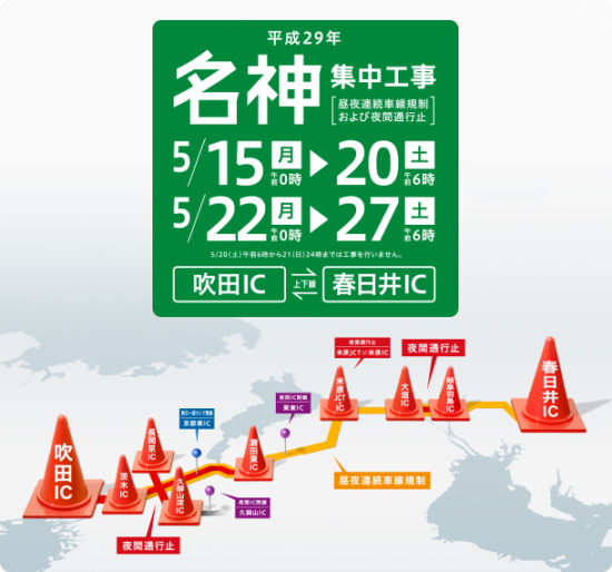 ホーム > つれづれ > 名神集中工事中みたいです!【吹田ー春日井】間 2017/05/18 今週末はセミナー。 車で遠方から来られる方は名神が集中工事中なのでご注意を。 って言っても肝心の土日の20日、21日はしてないみたいだから大丈夫だと思いますが(^_^;) http://meishin-info.com/ 平成29年度 「名神集中工事」(吹田IC~春日井IC)を実施します ― 5月15日(月曜)午前0時から5月20日(土曜)午前6時まで ― ― 5月22日(月曜)午前0時から5月27日(土曜)午前6時まで ― - つれづれ Tweet Please enable JavaScript to view the comments powered by Google+. Loading Facebook Comments ... Please enable JavaScript to view the comments powered by Facebook. Message コメントをキャンセルメールアドレスが公開されることはありません。 ※ が付いている欄は必須項目ですコメント ※ 名前 ※ メール ※ サイト Δ このサイトはスパムを低減するために Akismet を使っています。コメントデータの処理方法の詳細はこちらをご覧ください。 関連記事 iPhone6sに機種変完了! 阪急電車がやっと窓を開けだした・・・。 赤ちゃんはだっこして歩くと? アクトパル宇治で川遊び タラレバの話をしたらイケマセン。 早くもチケットを販売!! 寝冷え 奇跡!体重が増えたんだ PREV 最近のグミ事情ってこんなにすごいのか!? NEXT 高槻西武百貨店で九州物産展開催中