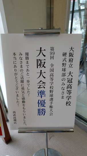 ホーム > 高槻 > 西武百貨店に粋な張り紙発見! 2017/08/02 2017/08/03 西武百貨店に行くとこんな張り紙がありました!! 高校野球ファンにはたまらない試合でした。 優勝したら横断幕とかいっぱい出てたんでしょうね、 いや準優勝でも出してもいいくらいだと思います。 - 高槻 Tweet Please enable JavaScript to view the comments powered by Google+. Loading Facebook Comments ... Please enable JavaScript to view the comments powered by Facebook. Message コメントをキャンセルメールアドレスが公開されることはありません。 ※ が付いている欄は必須項目ですコメント ※ 名前 ※ メール ※ サイト Δ このサイトはスパムを低減するために Akismet を使っています。コメントデータの処理方法の詳細はこちらをご覧ください。 関連記事 【杉玉】さんプレオープン・4/3 高槻駅前のイルミネーション 生タピオカ専門店台湾甜商店さんOPEN@阪急「高槻市駅」1階 阪急「茨木市駅」周辺整備計画 10/19・20は【食の文化祭】開催ですよ@高槻 【エニタイムフィットネス】が出来るみたい!(高槻) センター街でガラガラ抽選会中! JR高槻駅「神戸屋」さんが閉店 PREV 今日から8月。お盆の予定とか。 NEXT 移籍金なんと史上最高額となる約290億円