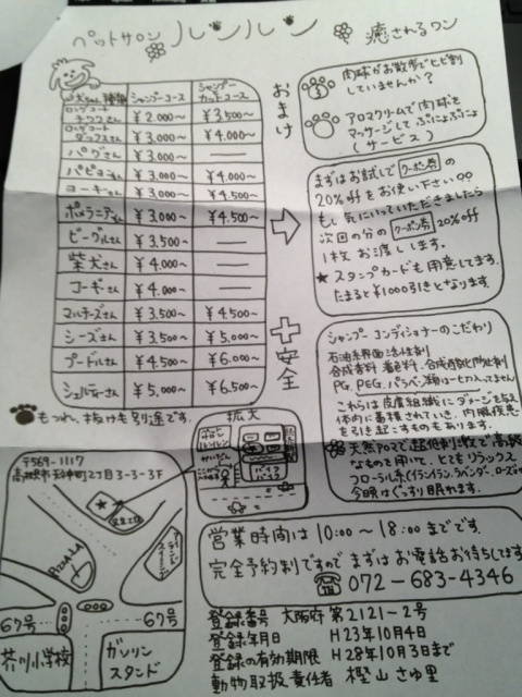ホーム > 高槻 > 『ペットサロン ルンルン』 2011/12/06 患者さんが開業されました。 女性でしかもお一人で、すごい勇気ですね! 業種はドッグトリミングです。 『ペットサロン ルンルン』です。ご自身もワンちゃんを飼われていますし、キャリアもバッチリ 年末のわんちゃんのサンパツは是非! - 高槻 Tweet 関連記事 明日25日は食べ歩きイベントの【たかつきバル】 池上彰さんの講演会が高槻で 【ステーキリバーべ】が11/11日OPEN なんじゃこれ!万博ビースト!! 高槻の病院で 食パン【銀座に志かわ】さんOPEN 高槻 JAZZ STREET 2009 5月3日、4日は高槻ジャズストリート! PREV ホッと NEXT 悪ふざけがすぎると・・・