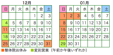 ホーム > 連絡事項 > 年末年始のお知らせ 2011/12/26 ★ 年末・年始のお知らせ 年末は30日まで・年始は4日から通常通り営業 31日〜3日までお休みいただきます。 世間はだいたい29からお休みのようですね。 残りあと一週間、集中力切らさずに頑張っていきます、年内にカラダをスッキリさせたい方はご連絡お待ちしてます!! - 連絡事項 Tweet 関連記事 明日11日(祝)は通常通り営業しています。 GWの営業案内 11/23日、24日はお休みです。 明日は通常通り営業しております^_^ 明日2/11日(祝)は営業しております。 明日の連絡事項(台風19号) 【みなと整体院】11/4(祝)は通常通り営業しております。 6月の営業案内 PREV これから NEXT 徐々に