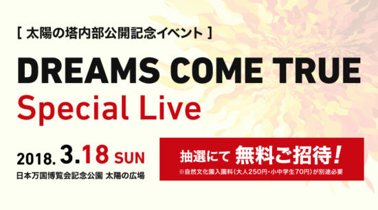 ホーム > つれづれ > 太陽の塔の内部公開&ドリカムライブ 2018/02/20 2018/02/21 みなさん大好き太陽の塔の内部公開が行われているのを知ってますか? →http://taiyounotou-expo70.jp/ 相当人気で5月まで公開予約可能なんですがすでに土日は予約で埋まっています。 またこれを記念して【ドリカム】が無料ライブを行ってくれます。 こちらは抽選方式まだ抽選申し込み期間です。 私もダメ元で申し込んでみました!! 当たったらラッキー!! 申込みはコチラ→http://taiyounotou-expo70.jp/dct_live/ - つれづれ Tweet Please enable JavaScript to view the comments powered by Google+. Loading Facebook Comments ... Please enable JavaScript to view the comments powered by Facebook. Message コメントをキャンセルメールアドレスが公開されることはありません。 ※ が付いている欄は必須項目ですコメント ※ 名前 ※ メール ※ サイト Δ このサイトはスパムを低減するために Akismet を使っています。コメントデータの処理方法の詳細はこちらをご覧ください。 関連記事 Wi-Fiスポットになる予定 つづき 大人のPARM!絶品! 京都の名物ドライブイン「やまがた屋」閉店 声楽家 来年の準備を! 3月終わり! ダンシング ダンシング 階段の掃除を自分で(笑)。 PREV 『ミッションインポッシブル6』2018年夏公開!! NEXT 大人のPARM!絶品!