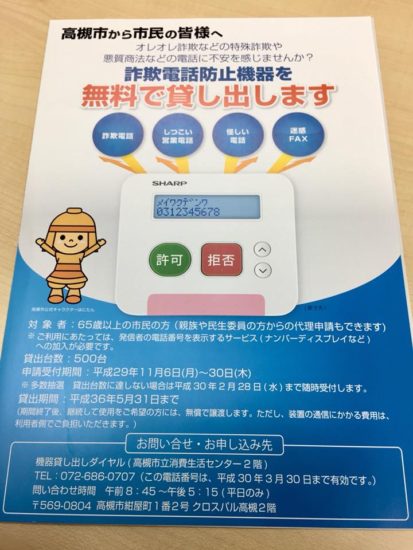 ホーム > 高槻 > 大阪府で『オレオレ詐欺』が一番多いのは高槻市(;´Д`) 2018/03/02 高槻市は大阪府下で一番オレオレ詐欺が多いようです… (泣) 高槻市では65歳以上の市民の方対象に詐欺電話防止機器を無料で貸し出ししてくれるようです。 (500台) - 高槻 Tweet Please enable JavaScript to view the comments powered by Google+. Loading Facebook Comments ... Please enable JavaScript to view the comments powered by Facebook. Message コメントをキャンセルメールアドレスが公開されることはありません。 ※ が付いている欄は必須項目ですコメント ※ 名前 ※ メール ※ サイト Δ このサイトはスパムを低減するために Akismet を使っています。コメントデータの処理方法の詳細はこちらをご覧ください。 関連記事 今日と明日は【高槻まつり】ですよ〜〜!2018年 秘伝の 高槻ふるさと納税が0円から大盛況に! 阪急高槻市駅前の【イタリアン・トマト】さん閉店 燕三条系 極太麺 高槻【かしわ つるや】さんのカモで鴨すき 高槻のお求めやすい居酒屋・・・ 「Italian kitchen VANSAN 高槻店」さんOPEN@7/30 PREV 開通割引を開始!新名神川西~神戸JCTが3月18日から NEXT 今年も必需品・・・。