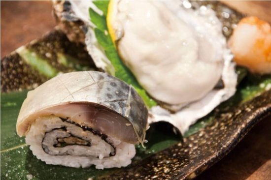 宇久はお馴染み鯖寿司と生牡蠣にシャンパングラスで飲むマスターズドリームを合わせます。