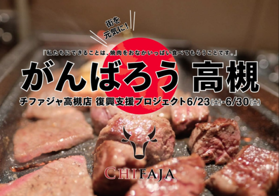 本格焼肉食べ放題チファジャ高槻店では2018年6月18日の大阪北部地震の復興支援として 同店の焼肉食べ放題に「がんばろうコース」を緊急手配し、6月23日(土)から30日(土)まで被災された皆様へ無料で提供し、店舗を開放いたします。