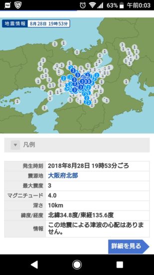ホーム > 高槻 > 今夜も震度3 2018/08/28 2018/08/29 20時頃揺れましたね。 また大阪北部・高槻が震源地^^; 震源地の上に立っております・・・。 6月の大型地震以来震度3以上がこれで20回以上になったみたいです。 熊本とか東北と比べるとたいしたことない気もしますがまだまだ続くんだろうなと・・・。 保存食で買っておいたカップ麺達もそろそろ賞味期限が切れてきそうなので買い足しておかないとと^^; - 高槻 Tweet Please enable JavaScript to view the comments powered by Google+. Loading Facebook Comments ... Please enable JavaScript to view the comments powered by Facebook. Message コメントをキャンセルメールアドレスが公開されることはありません。 ※ が付いている欄は必須項目ですコメント ※ 名前 ※ メール ※ サイト Δ このサイトはスパムを低減するために Akismet を使っています。コメントデータの処理方法の詳細はこちらをご覧ください。 関連記事 白いとうもろこし『ピュアホワイト』@真庭市場 JR高槻駅前がイルミネーション!実はボランティアみたいです。 お花のディスカウントショップ「パレット 」さんが高槻センター街にオープン@1/24 5/6日は通常通り営業します。 【新名神・高槻インターチェンジ】開通プレイベント 【Puka Organics】10月にOPENするサンドイッチ屋さん 煉瓦屋 ステーキ 高槻まつりに本物のミッキーが来るよ!! PREV シュアラスター のヘッドライトクリーナー試してみた NEXT ソフトバンクが新料金形態発表