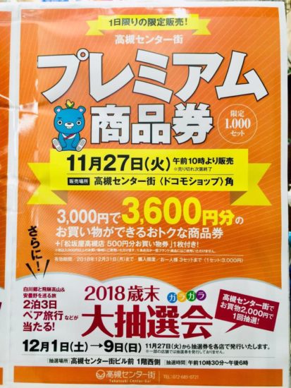 ホーム > 高槻 > 高槻センター街「プレミアム商品券」販売決定 2018/11/14 2018/11/16 みなさん大好き高槻センター街の「プレミアム商品券」の販売が決定したそうです。 3000円で3600円のお買い物ができるとってもお得な商品券 ・販売日は11月27日(火)午前10時〜 ・限定1000冊 ・お一人様3冊まで。 となっています。 詳しくはこちら→ http://www.centergai.net/index.php?プレミアム商品券 - 高槻 Tweet Please enable JavaScript to view the comments powered by Google+. Loading Facebook Comments ... Please enable JavaScript to view the comments powered by Facebook. Message コメントをキャンセルメールアドレスが公開されることはありません。 ※ が付いている欄は必須項目ですコメント ※ 名前 ※ メール ※ サイト Δ このサイトはスパムを低減するために Akismet を使っています。コメントデータの処理方法の詳細はこちらをご覧ください。 関連記事 街灯が【みなと整体院】を照らしてくれる。 高槻センター街に【錦もちつき屋】さんOPEN 高槻子育て応援券、もう少しで終了 ★高槻センター街プレミアム商品券販売決定☆彡6月27日(火)午前10時から先着順! 高槻のお求めやすい居酒屋・・・ 西真上に【熱帯食堂】さん5/30日OPEN 一軒め酒場が松坂屋裏にOPEN 本日は茨木の辯天花火大会 PREV 部品交換して修理してもらったけど NEXT あの「ROCCA & FRIENDS」さんがまた新店舗