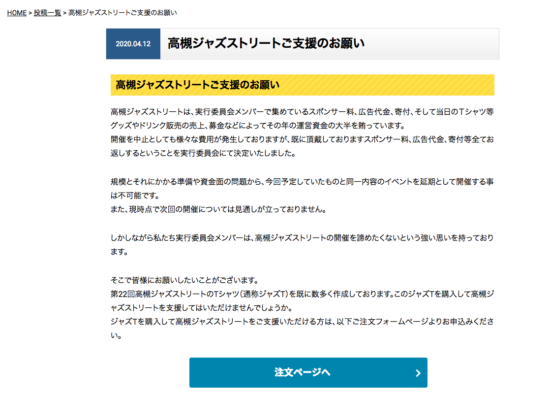 ギリギリまで開催できるか検討されていたようですが4/12日、2020年の高槻ジャズストリートの中止が発表されました。