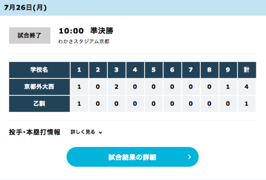 ホーム > 高校野球 > 乙訓高校ベスト4 2021/07/27 近所の乙訓高校べすと4止まり・・・! 惜しかったですね〜〜。 夏の甲子園初出場が見えていただけに・・・。 やっぱり夏の出場は難しい。 - 高校野球 Tweet Please enable JavaScript to view the comments powered by Google+. Loading Facebook Comments ... Please enable JavaScript to view the comments powered by Facebook. Message コメントをキャンセルメールアドレスが公開されることはありません。 ※ が付いている欄は必須項目ですコメント ※ 名前 ※ メール ※ サイト Δ このサイトはスパムを低減するために Akismet を使っています。コメントデータの処理方法の詳細はこちらをご覧ください。 関連記事 遊学館のアルプスが面白い!! 第100回大会の甲子園に行ってきました! 今年は高校野球100周年 京都【乙訓高校】が見事選抜高校野球の出場決定!! タイガー・ラグって秋田発祥だったんですね! 2016夏・全49代表高校が出揃った! 2023年夏は慶応が優勝@高校野球 今年の甲子園は三沢商業を応援しようかな! PREV メキシコに勝っちゃった! NEXT 中国に勝ったよ!