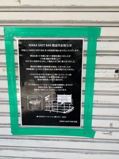 ホーム > 高槻 > NIKKA SHOT BARさんが閉店 2021/09/14 阪急高槻市駅からすぐの立ち飲み屋さん【NIKKA SHOT BAR】さんが閉店されていました。 13年か・・・、うちとほぼ同い年じゃないですか。 立ち飲み屋さんは辛いよね。 - 高槻 Tweet Please enable JavaScript to view the comments powered by Google+. Loading Facebook Comments ... Please enable JavaScript to view the comments powered by Facebook. Message コメントをキャンセルメールアドレスが公開されることはありません。 ※ が付いている欄は必須項目ですコメント ※ 名前 ※ メール ※ サイト Δ このサイトはスパムを低減するために Akismet を使っています。コメントデータの処理方法の詳細はこちらをご覧ください。 関連記事 セカンドストリート(買取専門店)がOPEN センター街の「ジャンカラ」さんがやはり閉店 伏見屋(お豆腐・湯葉)さんOPEN 徐々に 食パンの次は芋ブーム到来! 大阪青凌中学校・高等学校が4月に島本町へ移転 3月に「牛角」OPEN予定 駿河屋さんが【トレカ館】OPEN!4/7 PREV マトリックスが NEXT iPhone13発表