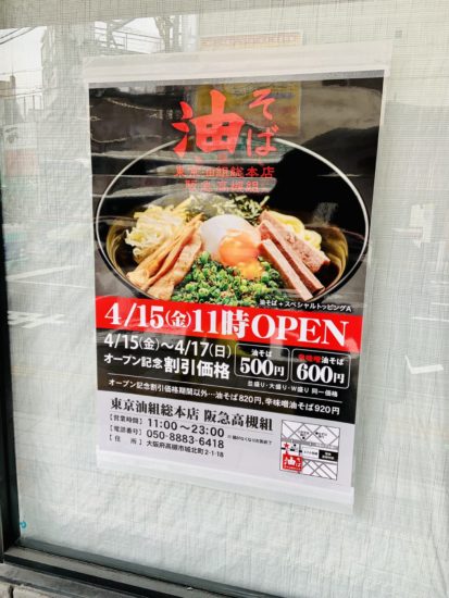 ホーム > 高槻 > ガストの横に「油そば屋」さんOPEN 2022/04/16 まぜそばは聞いたことがありますが、今度は油そばですか? 阪急高槻市駅高架下のガストの横、サイゼリアとの間に【東京油組総本店 阪急高槻組】さんが4/15日OPEN オープンから3日間は油そばが500円とのことなので行列できてるみたいですが、行けなかった、、、足が向かなかったです。 また今度。 【新店情報】 油そば 東京油組総本店 高槻組@阪急高槻市 4月15日オープン。 油そば 820円 東京にある『東京油組総本店』の支店です。オープン3日間は油そばを500円、辛味噌油そばを600円で提供しています(^-^) https://t.co/nQBtxD4q5F pic.twitter.com/mNodDwCArN — とよつね (@toyotue) April 15, 2022 - 高槻 Tweet Please enable JavaScript to view the comments powered by Google+. Loading Facebook Comments ... Please enable JavaScript to view the comments powered by Facebook. Message コメントをキャンセルメールアドレスが公開されることはありません。 ※ が付いている欄は必須項目ですコメント ※ 名前 ※ メール ※ サイト Δ このサイトはスパムを低減するために Akismet を使っています。コメントデータの処理方法の詳細はこちらをご覧ください。 関連記事 高槻の魚屋 「鶴金」→「鮪と炭火串 トロたん」にリニューアル センター街でガラガラ抽選会中! 人気の高槻老舗・甘味どころのカレーをやっと食べられました。 明日は高槻魂!野外ライブ 7/1日から【スクラム高槻】使っていただけます。 春を告げるお祭り!天神祭 精肉【肉のやまかわ】さんOPEN PREV 今年こそ高槻ジャズストリート無事に NEXT 宇治のアクトパルへ