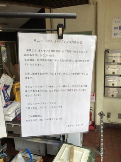 ホーム > 高槻 > きんせい高槻駅前店が改装工事 2023/06/28 きんせい高槻駅前店が営業してない?! と「閉店?」思って焦って覗いてみたら よかったリニューアル工事中でした。 内装がきれいになって6月29日にOPEN予定だそうです(^o^) 7月にかけて高槻界隈も新規OPENも増えそうです。 - 高槻 Tweet Please enable JavaScript to view the comments powered by Google+. Loading Facebook Comments ... Please enable JavaScript to view the comments powered by Facebook. Message コメントをキャンセルメールアドレスが公開されることはありません。 ※ が付いている欄は必須項目ですコメント ※ 名前 ※ メール ※ サイト Δ このサイトはスパムを低減するために Akismet を使っています。コメントデータの処理方法の詳細はこちらをご覧ください。 関連記事 8b DOLCE@高槻 「純愛カレーうどんなでしこ~長女~」が1月中旬OPEN 撤退か…?出たのか…? 高槻島本夜間休日応急診療所が移転OPEN 3年ぶりの茨木辯天花火 「りくろーおじさん」が松坂屋に 明日は子供大好き【高槻センター街夜まつり】 川西IC~神戸JCTが平成30年3月18日(日曜)に開通 PREV 松坂屋に「熱帯食堂」さんOPEN NEXT 7月ですね!