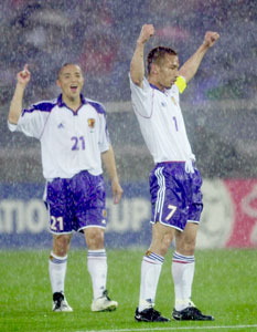 大雨の中、中田英寿(29)の火の出るような強烈な地をはうシュートが壁の間をすり抜け、ゴールネットを揺らした。