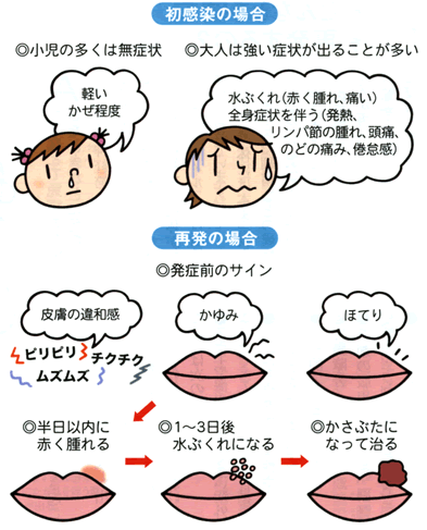 風邪、疲労、ストレス、紫外線等の要因によって発症しやすい。
