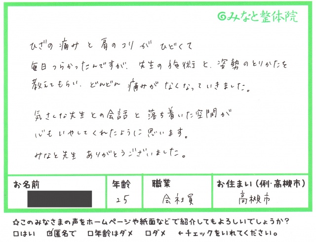 ホーム > 患者さんの声 > 膝の痛みと肩こり 2010/05/17 肩こりも膝の痛みもどんどん良くなってくれました。 すごく胸を張ってしまっている姿勢だったのでやめてもらうように指導。あと立ち方と。 ちゃんとしっかり守ってくれました。 胸を張らない姿勢を受け入れるか楽とはわかっていても、猫背な気がして受け入れられないか。 楽な姿勢でいるのがダメ!という感覚の方は非常に多いですね。 でも「目からうろこです。」と喜んでくれる人も多い。 昨日の常識は、今日の非常識。 - 患者さんの声 Tweet 関連記事 よくならなかった首のもやもや 久しぶりに感想を頂いたのでご紹介! コートネーム→煌「ファン」 腰痛@バドミントン 膝の痛み!水がたまる・・・。 更新しました。 長年の腰と膝の痛み 手首が痛い PREV 我が家も無線です。 NEXT グレイソン