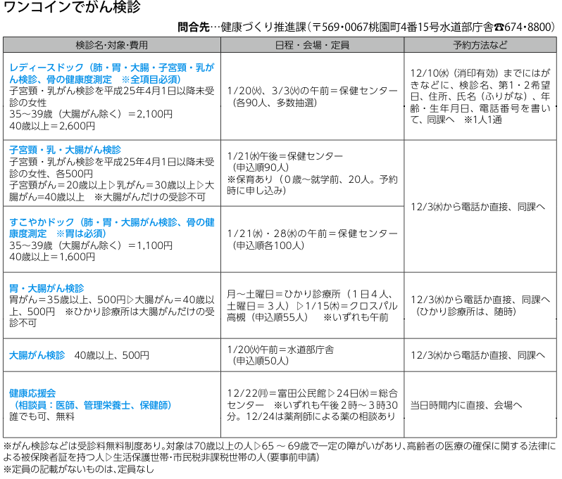 ホーム > 高槻 > 高槻市がワンコインでがん検診・健康診断しています。 2014/12/09 2014/12/10 クリックしていただくと、拡大されるので見やすいと思います。 ●レディースドック ●子宮頸・乳・大腸がん検診 ●すこやかドック(肺・胃・大腸がん検診、骨の健康度測定 ※胃は必須) ●胃・大腸がん検診 ●健康応援会(相談員:医師、管理栄養士、保健師) とやっていくれているようです。 詳しい情報は高槻市のホームページに記載されていますので参考にして下さい。 →http://www.city.takatsuki.osaka.jp/kakuka/kenkouf/kensui/gyomuannai/kenshin/gankensinkakusyukensin/shudan/index.html - 高槻 Tweet Please enable JavaScript to view the comments powered by Google+. Loading Facebook Comments ... Please enable JavaScript to view the comments powered by Facebook. Message コメントをキャンセルメールアドレスが公開されることはありません。 ※ が付いている欄は必須項目ですコメント ※ 名前 ※ メール ※ サイト Δ このサイトはスパムを低減するために Akismet を使っています。コメントデータの処理方法の詳細はこちらをご覧ください。 関連記事 がんこ寿司さんがリニューアル 100円パン【伊三郎製ぱん】が松坂屋に 高槻はあんなことろからこんなとこまで、あちこちでジャズ模様! 高槻バル やっとガスが通ってきたみたい! 子育て応援券 きんせいの暖簾分け 夏の終り PREV やよい軒リニューアル、そしてみなと整体院の裏にビルが建ちます。 NEXT 連絡事項=11、12日と研修のためお休みさせていただきます。