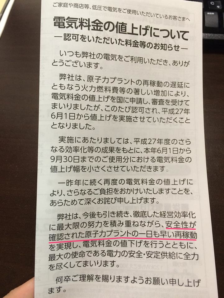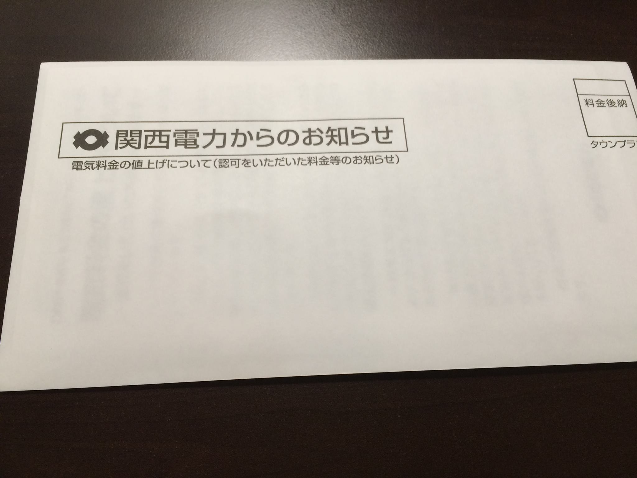 ホーム > つれづれ > 関電からの噂の値上げお知らせが届いた件。 2015/06/03 2015/06/03 来てました、来てました、当院にもこの封筒が 先日の6月1日から実質値上げ実施 2年前より1300円アップ 6〜9月は平均4.62%、10月以降は同8.36%値上げ 原発を推進する怪文章が世論を誘導する文章だと話題になっています。 - つれづれ Tweet Please enable JavaScript to view the comments powered by Google+. Loading Facebook Comments ... Please enable JavaScript to view the comments powered by Facebook. Message コメントをキャンセルメールアドレスが公開されることはありません。 ※ が付いている欄は必須項目ですコメント ※ 名前 ※ メール ※ サイト Δ このサイトはスパムを低減するために Akismet を使っています。コメントデータの処理方法の詳細はこちらをご覧ください。 関連記事 今日は宵宵山か〜〜。 健康診断の結果が返ってきました! またもや全敗^^; ミスチルでした 梅の花、春近し! iPhoneが欲しけれ… 右腕負傷の骨模型。完治まで 台風16号/夕方からやんでよかった。 PREV 日本代表メンバー発表(W杯二次予選)、海外組中心かな? NEXT 関西最大級のガーデンセンター「ザ・ファーム ユニバーサル」に行ってきました!!その1