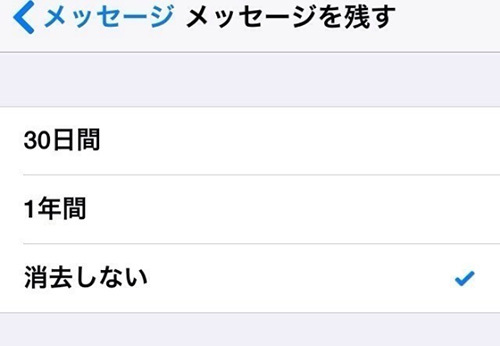 →2・iPhoneの「設定」 → 「メッセージ」 → 「メッセージを残す」を選択すると、次の三択が出現。「30日間」、「1年間」、「消去しない」