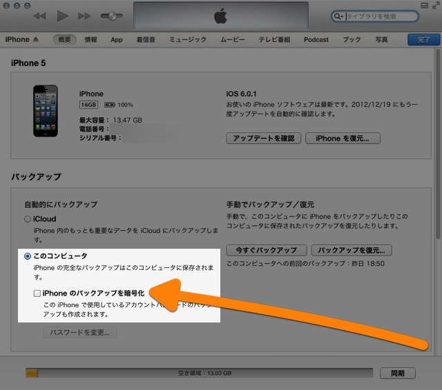 この時に「暗号化する」のチェックをはずしてしてバックアップを取る