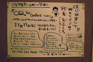 ホーム > つれづれ > by Yuko 2010/11/11 本日ポッキーの日に戦友が開業しました。 OQ for Ladies by Yuko 場所は京都の四条大宮阪急の大宮駅降りてすぐです。 女性のための女性による治療院。 リラクゼーション的なマッサージでなく女性施術の治療院というのは少ないと思うので男性に治療されるのが抵抗のある女性など興味のある方は是非!! - つれづれ Tweet 関連記事 アルスラーン戦記第二期始まった(^^) 今日と明日は大学入学共通テスト バドミントン強いな〜〜〜! 食欲旺盛 会場GET 大分と 奇跡のりんご 我が家も無線です。 PREV イチローに心奪われたら NEXT 今秋は