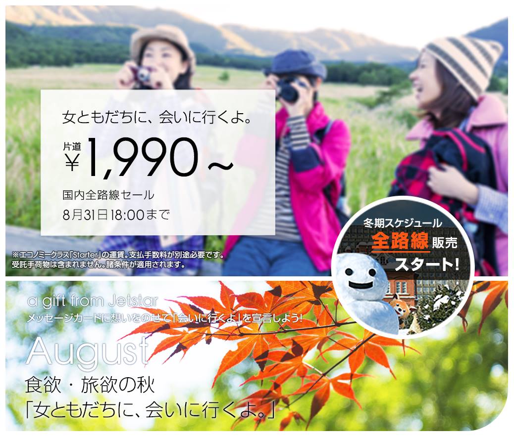 ホーム > つれづれ > ジェットスター本日から、1990円セール! 2015/08/19 「女ともだちに、会いに行くよ。」セール 冬期スケジュールのフライトがセール対象! (スマホ)http://bit.ly/js150819fbm (PC)http://bit.ly/js150819fbw ※セールは17:00~ 半年に一度ほどジェットスターさんはこのセールをしてくれるんですよね。 偽りなく1990円でいけるからすごい、私も関空まで近かったら大いに利用価値がグッと上がるんですが、2時間近くかかるので関空までの距離だけがネック。。。 ちなみに1990円で関西から行けるのはこの日程です。 http://www.jetstar.com/jp/ja/~/_media/8162E93168BE43DC9FCC8E00699FD71F.ashx - つれづれ Tweet Please enable JavaScript to view the comments powered by Google+. Loading Facebook Comments ... Please enable JavaScript to view the comments powered by Facebook. Message コメントをキャンセルメールアドレスが公開されることはありません。 ※ が付いている欄は必須項目ですコメント ※ 名前 ※ メール ※ サイト Δ このサイトはスパムを低減するために Akismet を使っています。コメントデータの処理方法の詳細はこちらをご覧ください。 関連記事 スパッツデビュー! さあさあ今日から仕事始め ただいま☆ 岩盤浴ブーム 宇宙兄弟 明日は午後からの営業です。 100人規模の デロンギさんのハイテク暖房機、気持ちよく暖かそうです。 PREV 白いとうもろこし『ピュアホワイト』@真庭市場 NEXT 100年の栄冠は【東海大相模】へ