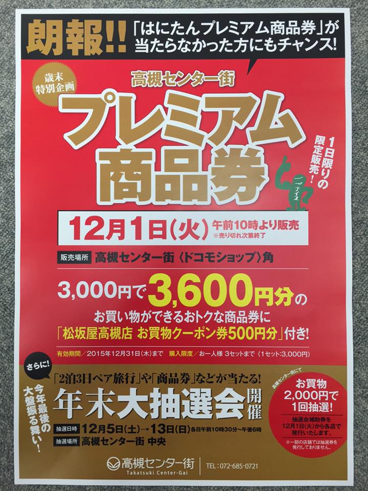 何事かとよく見てみると「高槻センター街プレミアム商品券」を販売されていました。
