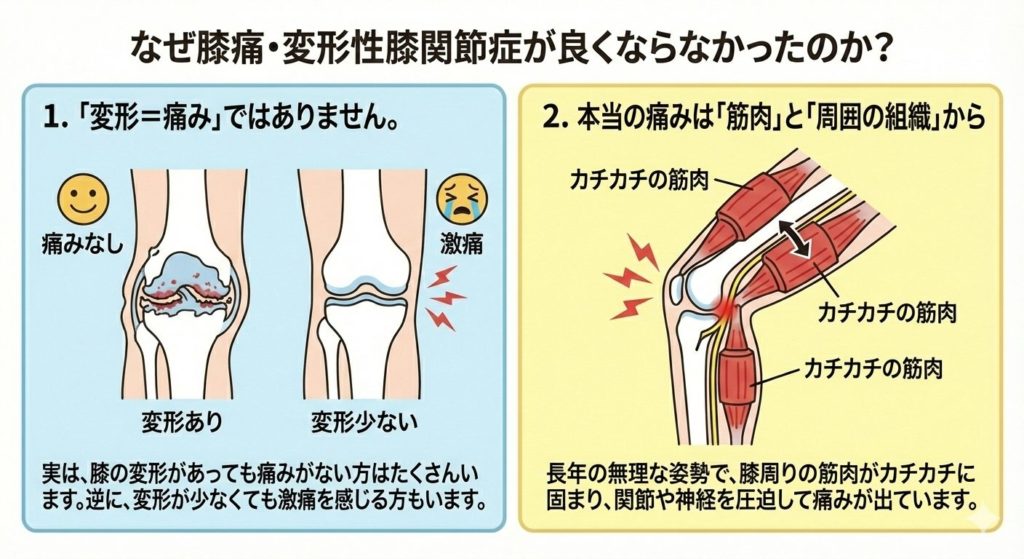 長年の無理な歩き方や姿勢によって、膝周りの筋肉が「カチカチのゴム」のように固まっています。この固まった筋肉が関節を引っ張ったり、神経を圧迫したりすることで痛みが出ているケースが非常に多いのです。