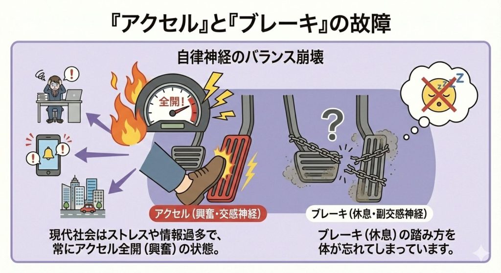 自律神経は、興奮の「交感神経」とリラックスの「副交感神経」がバランスを取っています。現代社会はストレスやスマホの使いすぎによる情報過多で、常にアクセル全開の状態(興奮)。ブレーキ(休息)の踏み方を体が忘れてしまっています。