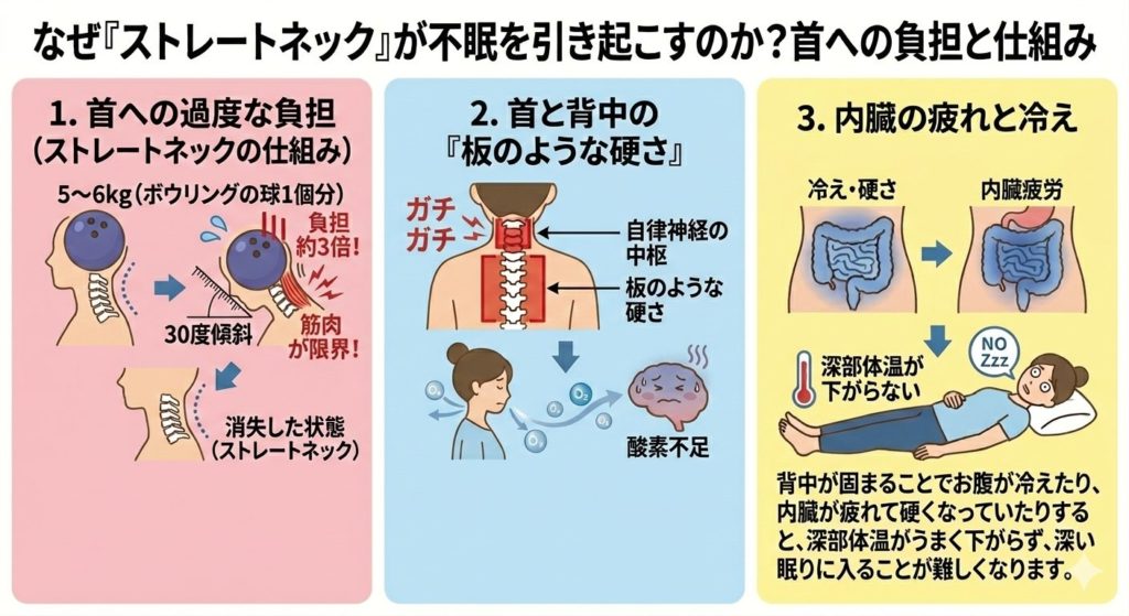 首には脳と全身をつなぐ重要な神経が密集しています。首が固まると、痛みだけでなく「頭痛・不眠・めまい」といった自律神経の乱れを引き起こす大きな原因となります。