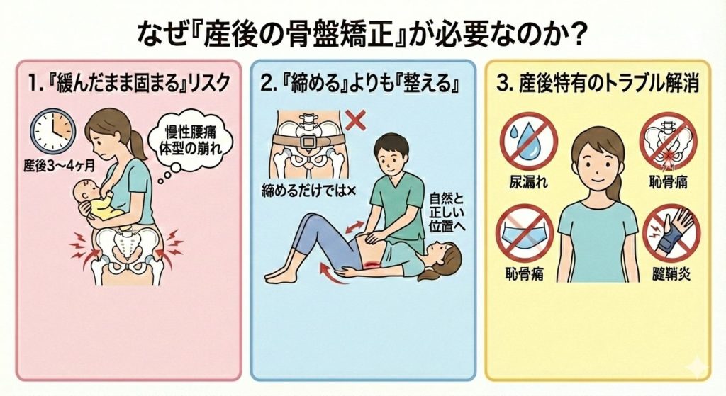 - 「緩んだまま固まる」リスク: 出産で開いた骨盤は、授乳や抱っこで姿勢が崩れたまま固まってしまうと、将来的な「慢性腰痛」や「体型の崩れ」の原因になります。