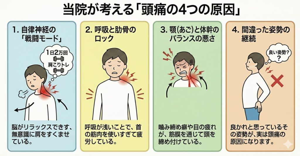 - 顎(あご)と体幹のバランスの悪さ: 噛み締め癖や目の疲れが、筋膜を通じて肩や頭を締め付けている。